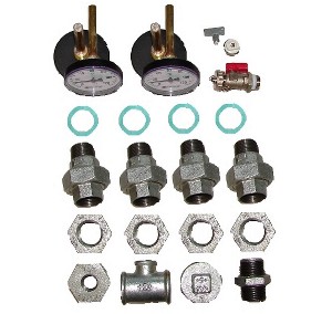 Verzinkte Fittings: 2x Verschr. I-A flachdichtend DN 25 (1") 2x Reduzierstück DN 32 (1 1/4") x DN 25 (1") 2x Dichtung DN 25 (1") 2x Doppelnippel DN 25 (1") 2x T-Stück DN 25 (1") x DN 15 (.1/2") x DN 25 (1") 1x Handentlüfter DN 15 (1/2") 1x Rolle Dichtungshanf und 1x Tube Fermit